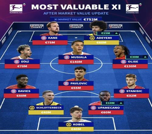 德国转会市场盘点了最新身价更新后的德甲最贵阵容。拜仁与多特“包围式”入选,穆西亚拉、奥利塞、凯恩等领衔锋线与边路,话题度瞬间拉满——这套身价十一人,你认可吗?数据截至:2025年10月15日。