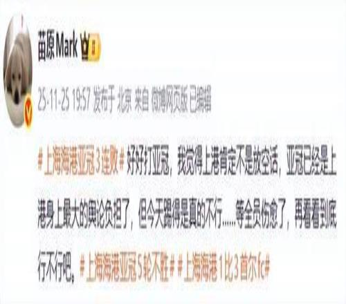 另一位足球记者苗原老师则表示,“好好打亚冠,我觉得上港肯定不是放空话,亚冠已经是上港身上最大的舆论负担了,但今天踢得是真的不行……等全员伤愈了,再看看到底行不行吧。”显然,苗原老师说得很含蓄了,他把责任推给了伤病,问题是,真的是伤病吗?