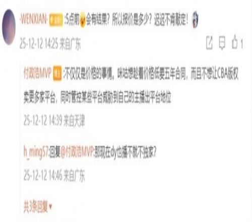 关于CBA与咪咕的谈判,事实上已经进行了很多次,在评论中和网友互动时,媒体人付政浩表示:“不仅仅是价格的事情。咪咕想趁着价格低要五年合同,而且不想让CBA版权卖更多家平台,同时管控某些平台威胁到自己的主播出平台地位。”所以,这是一箭三雕。